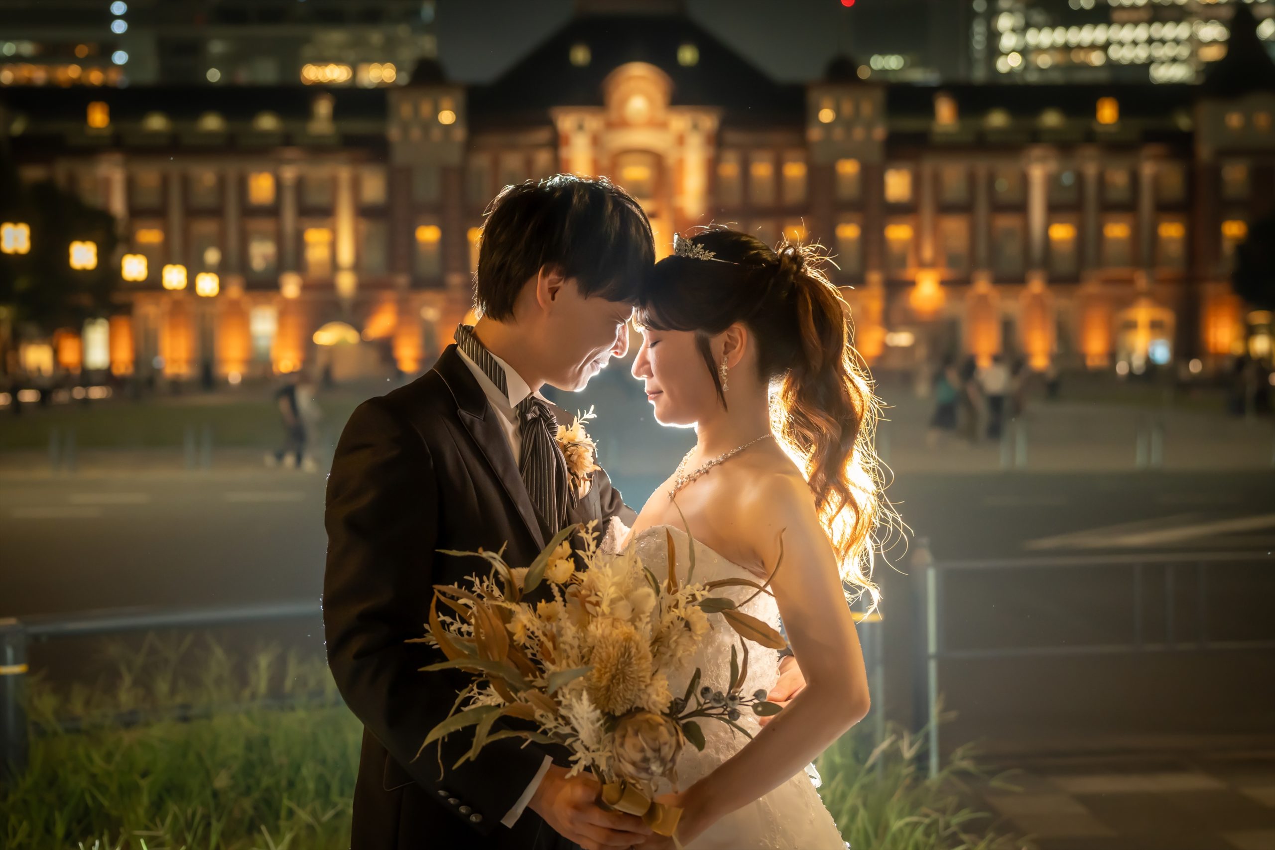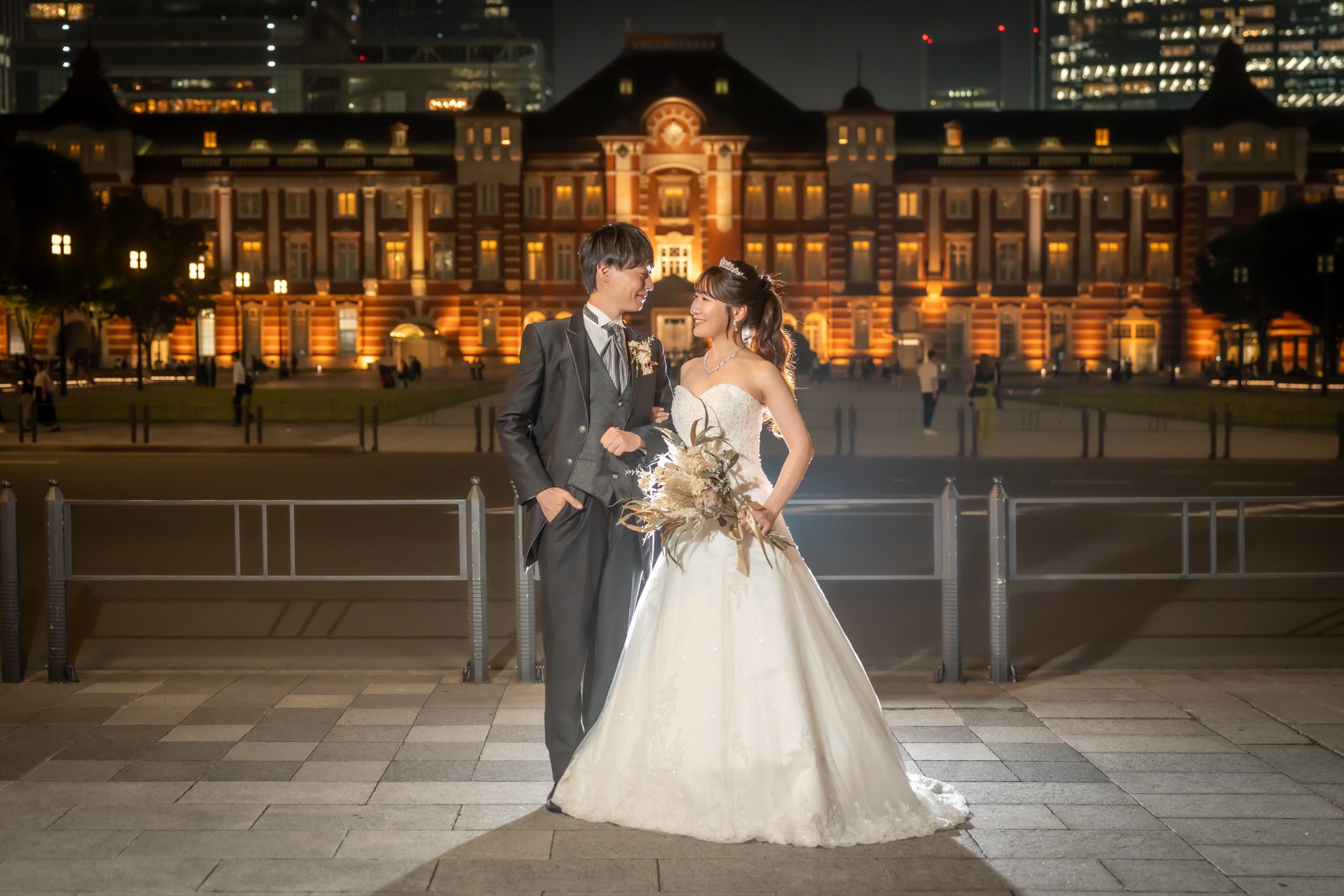 東京駅の灯りを背に見つめ合うふたりが、とてもロマンチックですね。ブーケを抱く花嫁の横顔も美しくナイトロケならではの特別感がしっかり伝わってきますよね。
