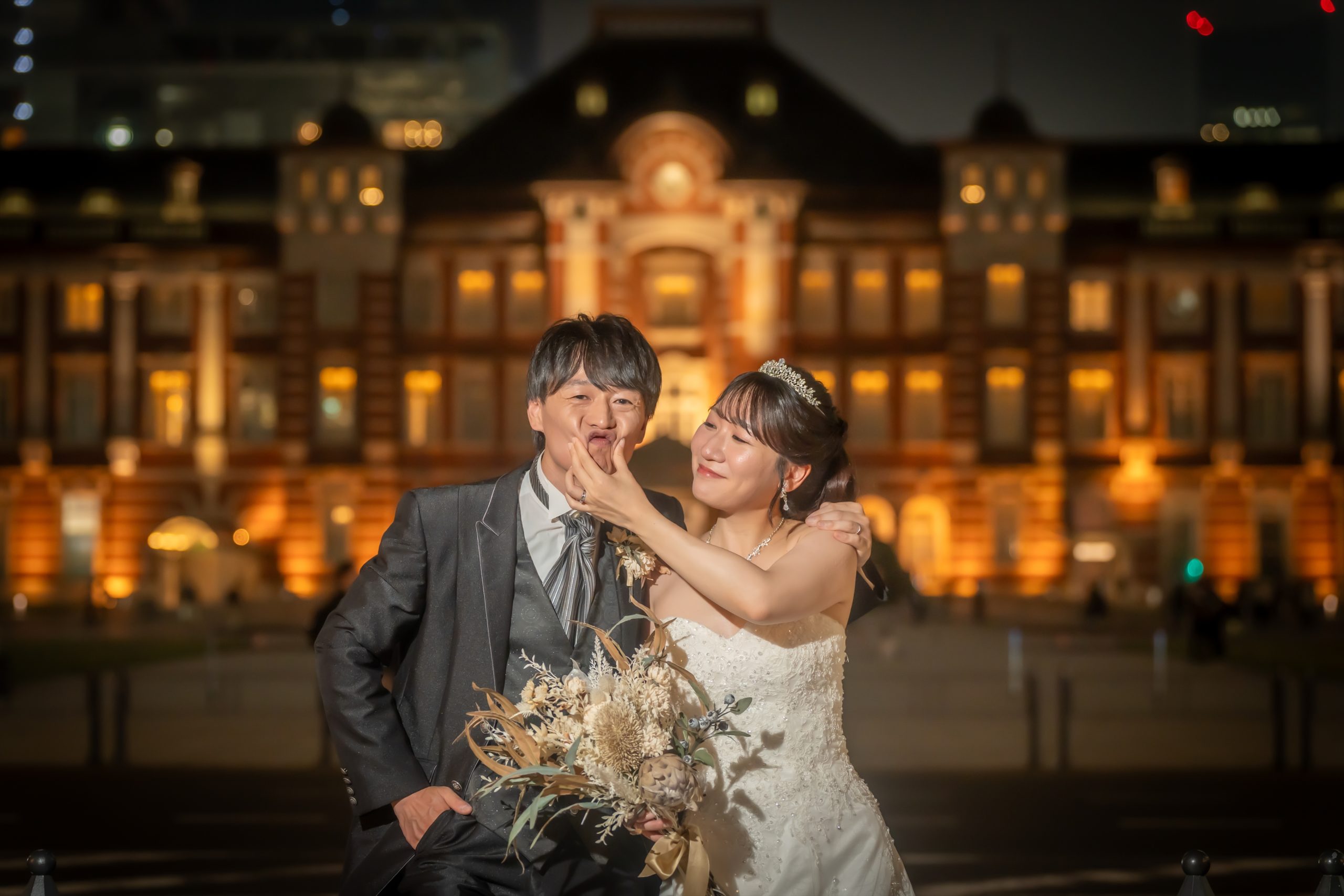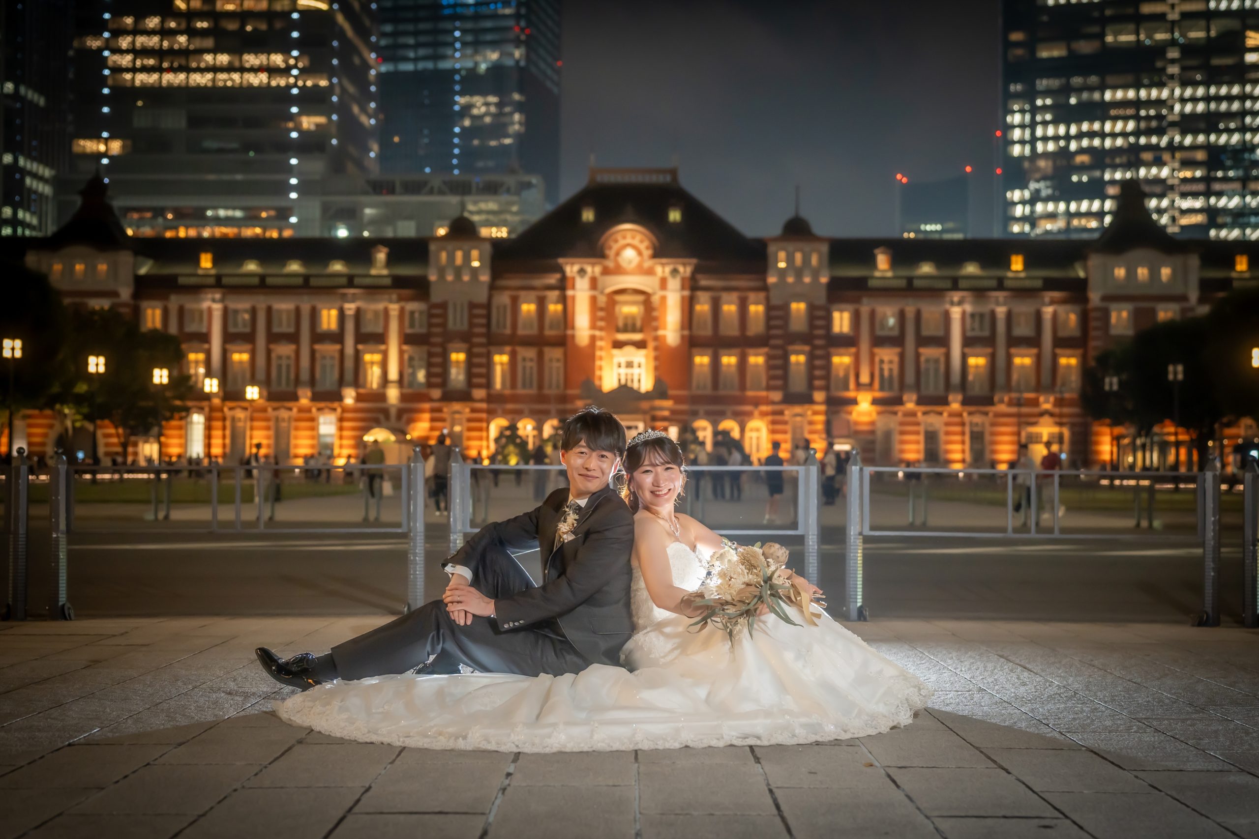 東京駅の光を背景に並んで座る姿が、まるでナイトピクニックのようで可愛いですね。白ドレスの広がりとブーケの彩りが夜景に映えて、特別な時間を感じますよね。