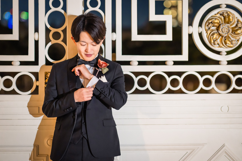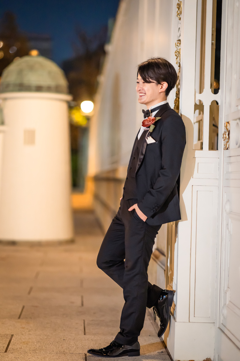 新郎さまはオールブラックのベーシックタキシード。